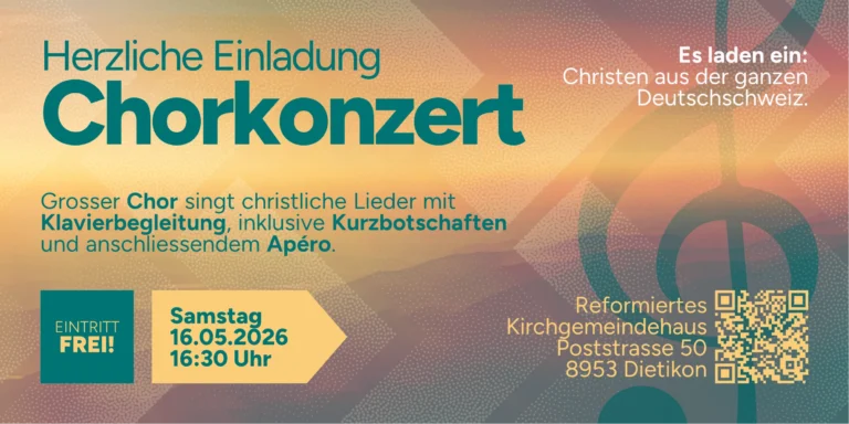 Grosser Chor singt christliche Lieder mit Klavierbegleitung, inklusive Kurzbotschaften und anschliessendem Apéro.